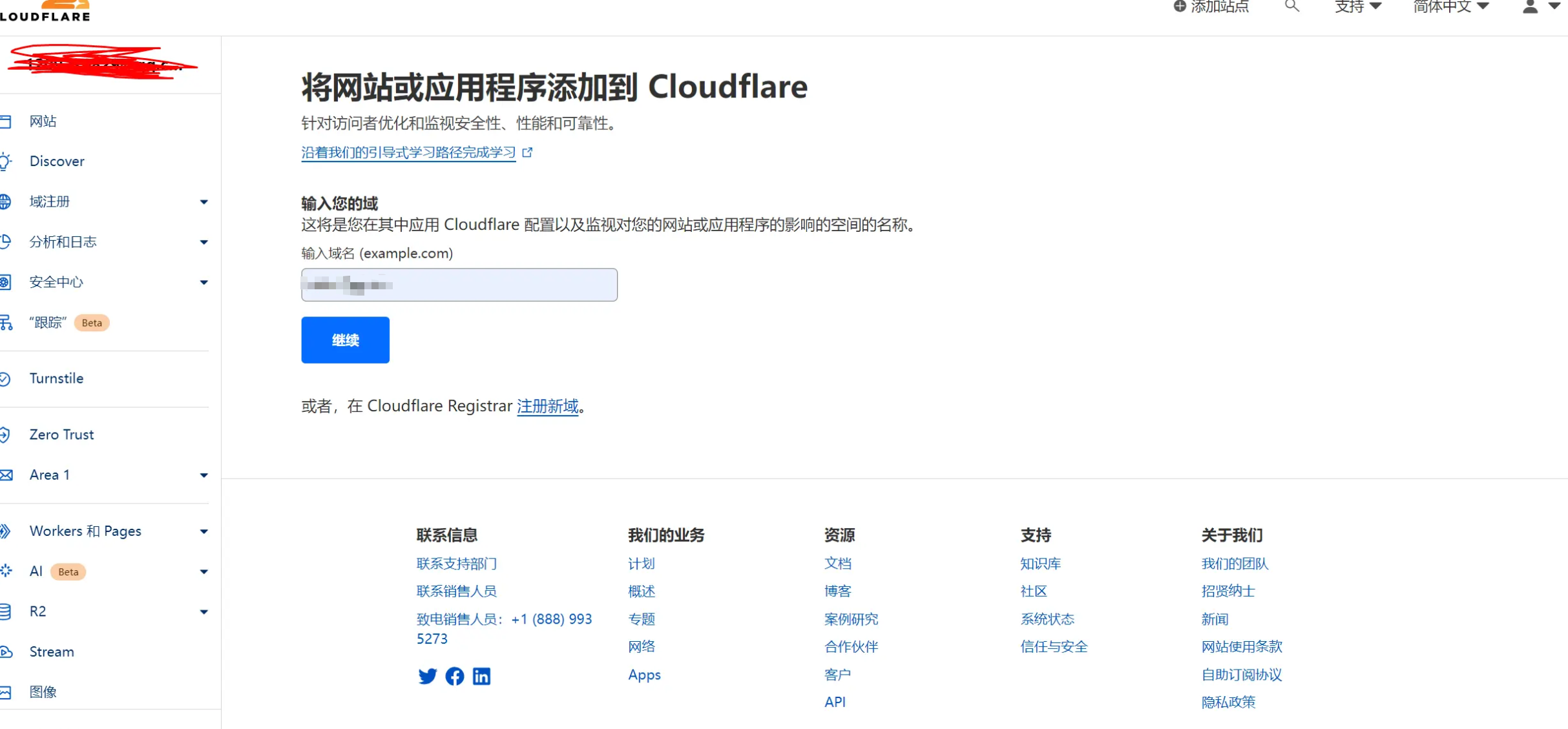 然后点击右侧的这个添加站点按钮就好了,进入下一步,输入你要加的域名 然后点击继续:
