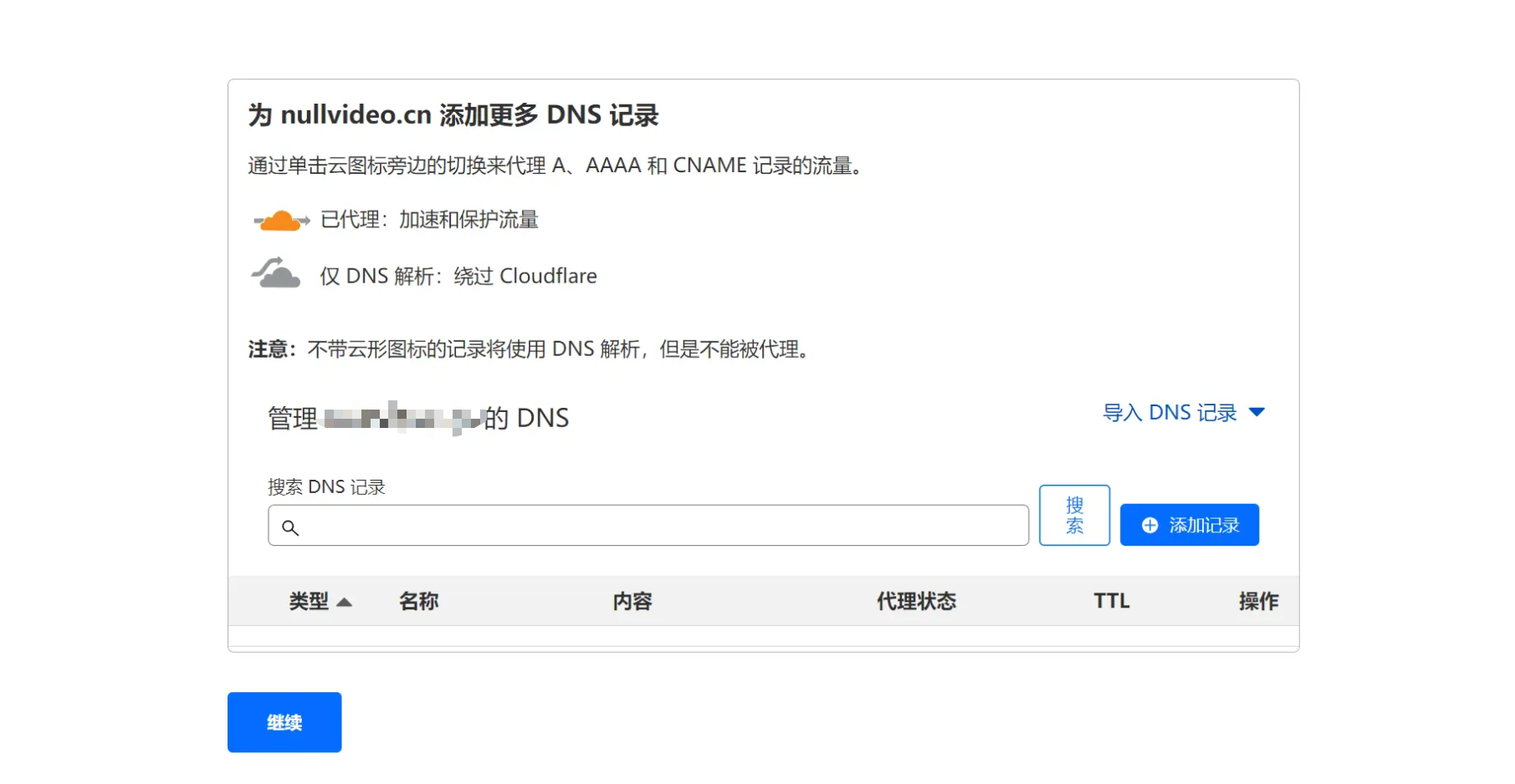 接下来 Cloudflare 会自动扫描你的部分dns记录。我这个域名是刚刚买的还没有进行一些解析的操作,所以是没有记录的。点击继续: