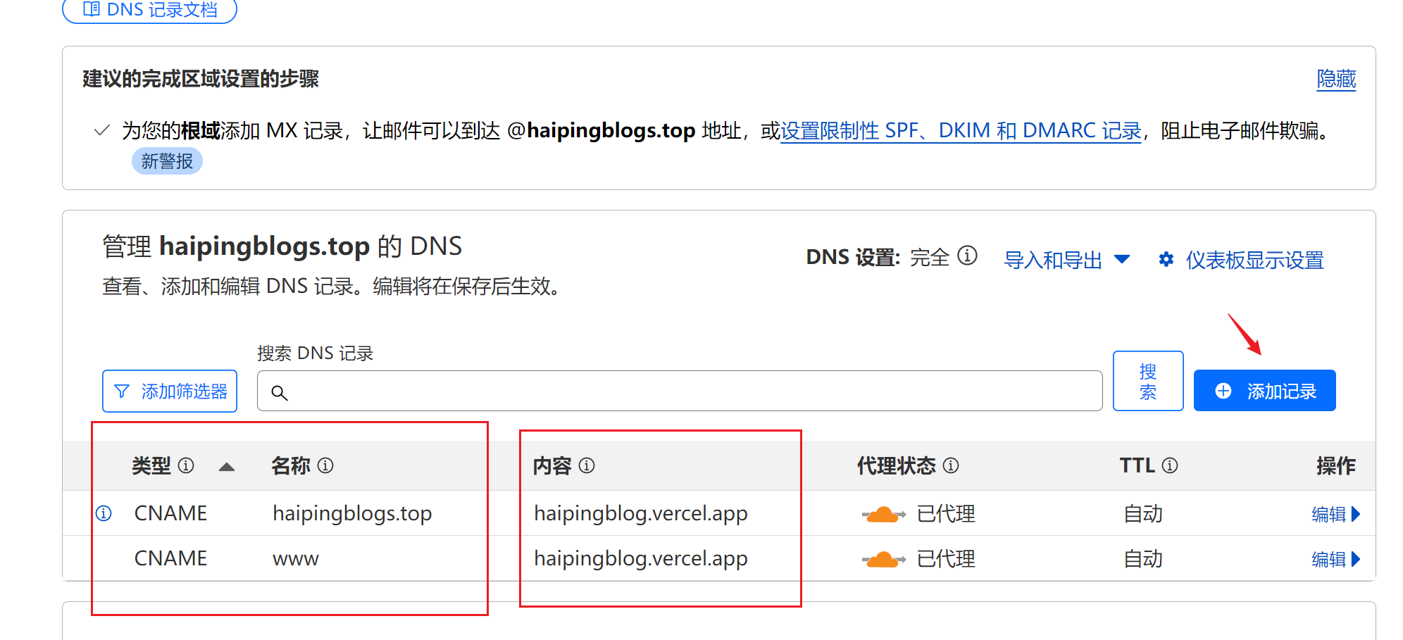在 Cloudflare 添加 CNAME 类型的解析,比如这个项目就是把我们的域名重定向到vercel的项目上,并打开 proxy 服务。我在这边为了对应根路径访问和www访问,两个都加上了。